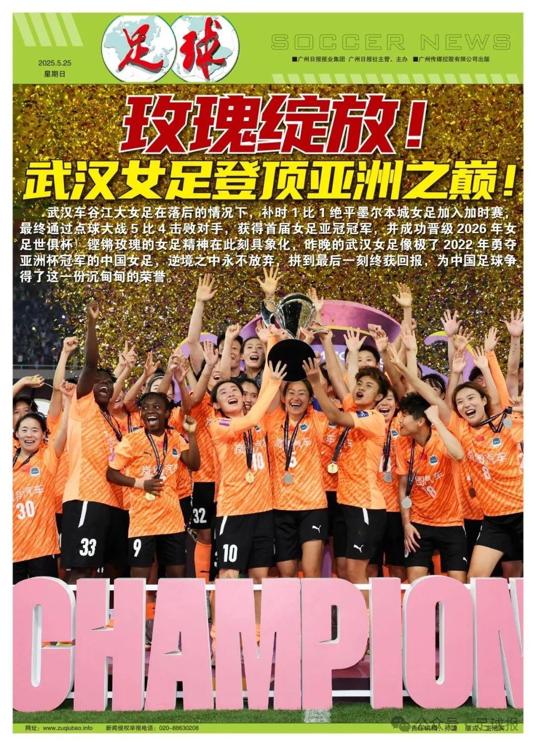 據悉,獲得本屆亞冠冠軍的武漢女足還將獲得衝擊更高榮譽的資格,亞冠冠軍身份讓他們獲得參加2026年女足冠軍盃資格,球隊將在2026年1月至2月出徵,首輪對陣大洋洲冠軍奧克蘭聯女足,若取勝將迎戰非洲冠軍球隊,再晉級將在半決賽迎戰新科女足歐冠冠軍阿森納。