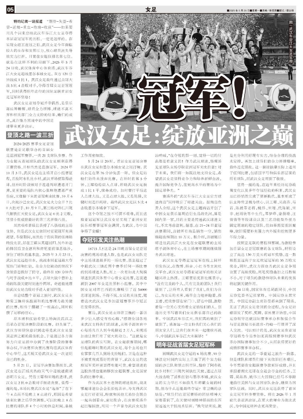 特約記者一說報道 “期待-失望-希望-逆境-重生-絕境-收穫”——如果要用幾個詞來總結武漢車谷江大女足奪得本屆亞冠冠軍的歷程,一定是這樣的。在實現女超五連冠之後,武漢女足今年面臨較大的生存和發展壓力,核心球員流失導致實力打折,目前在女超僅排名第七位。就是在這樣不利的局面下,2025年5月24日晚,武漢體育中心體育場,武漢車谷江大女足迎戰墨爾本城女足。雙方120分鐘戰成1比1,武漢女足最終通過點球大戰5比4擊敗對手,奪得首屆女足亞冠冠軍,同時獲得明年進行的國際足聯首屆女足冠軍盃資格!
