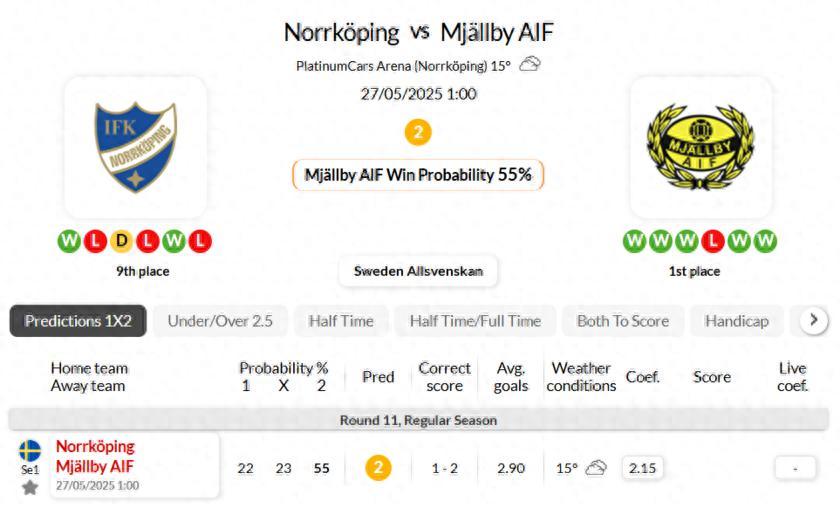 北雪平在瑞典超的主場比賽中的平均進球數爲2.00