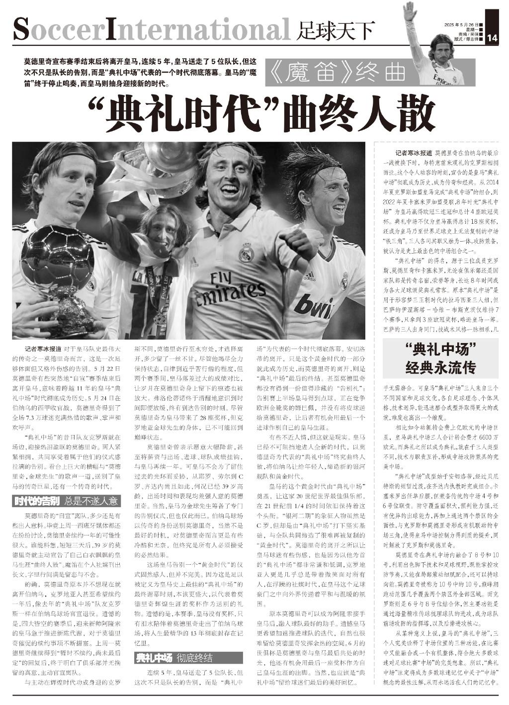 《魔笛》終曲:莫德里奇宣佈賽季結束後將離開皇馬,連續5年,皇馬送走了5位隊長,但這次不只是隊長的告別,而是“典禮中場”代表的一個時代徹底落幕。皇馬的“魔笛”終於停止鳴奏,而皇馬則抽身迎接新的時代。