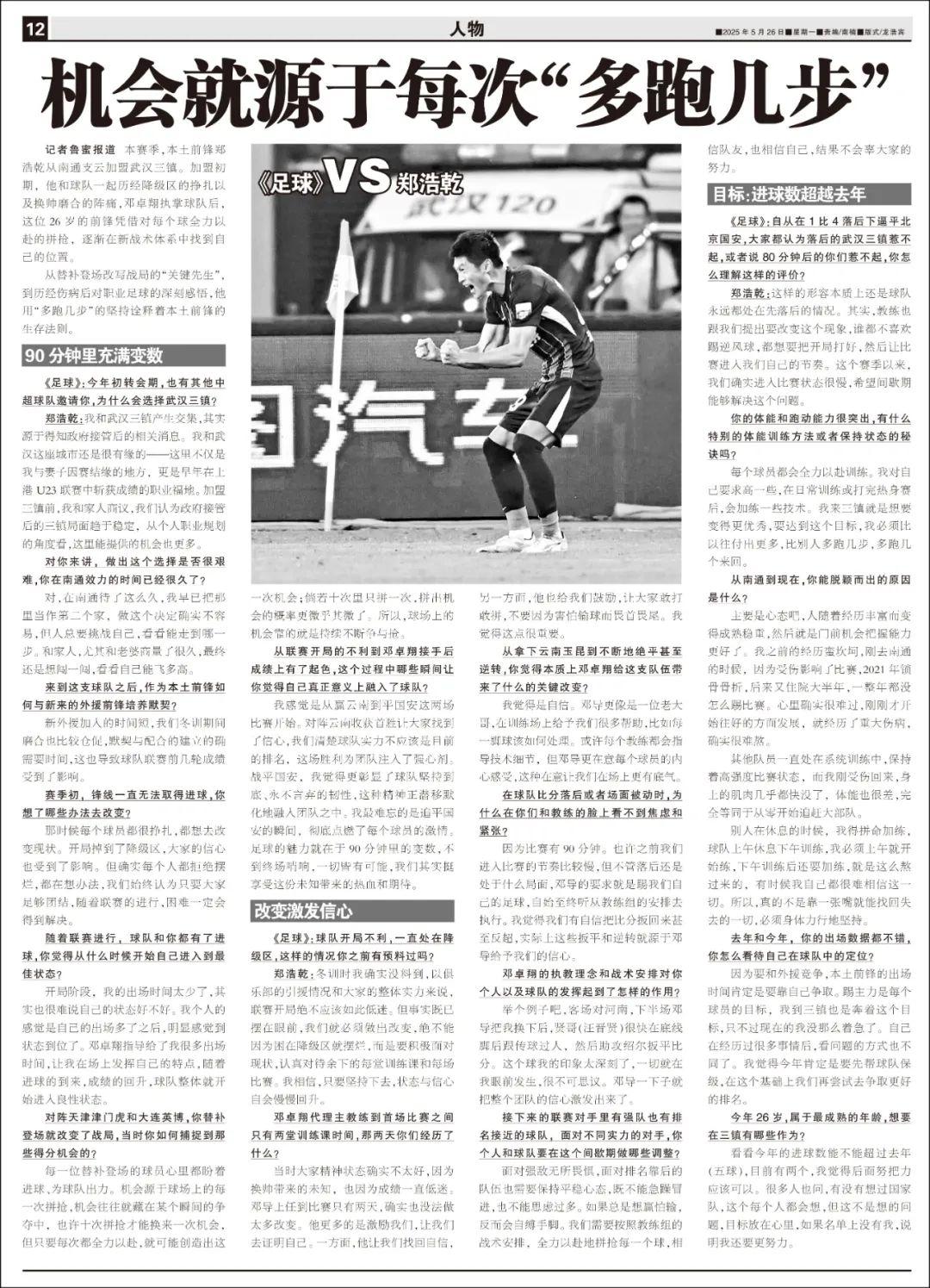 記者魯蜜報道 本賽季,本土前鋒鄭浩乾從南通支雲加盟武漢三鎮。加盟初期,他和球隊一起歷經降級區的掙扎以及換帥磨合的陣痛,鄧卓翔執掌球隊後,這位26歲的前鋒憑藉對每個球全力以赴的拼搶,逐漸在新戰術體系中找到自己的位置。