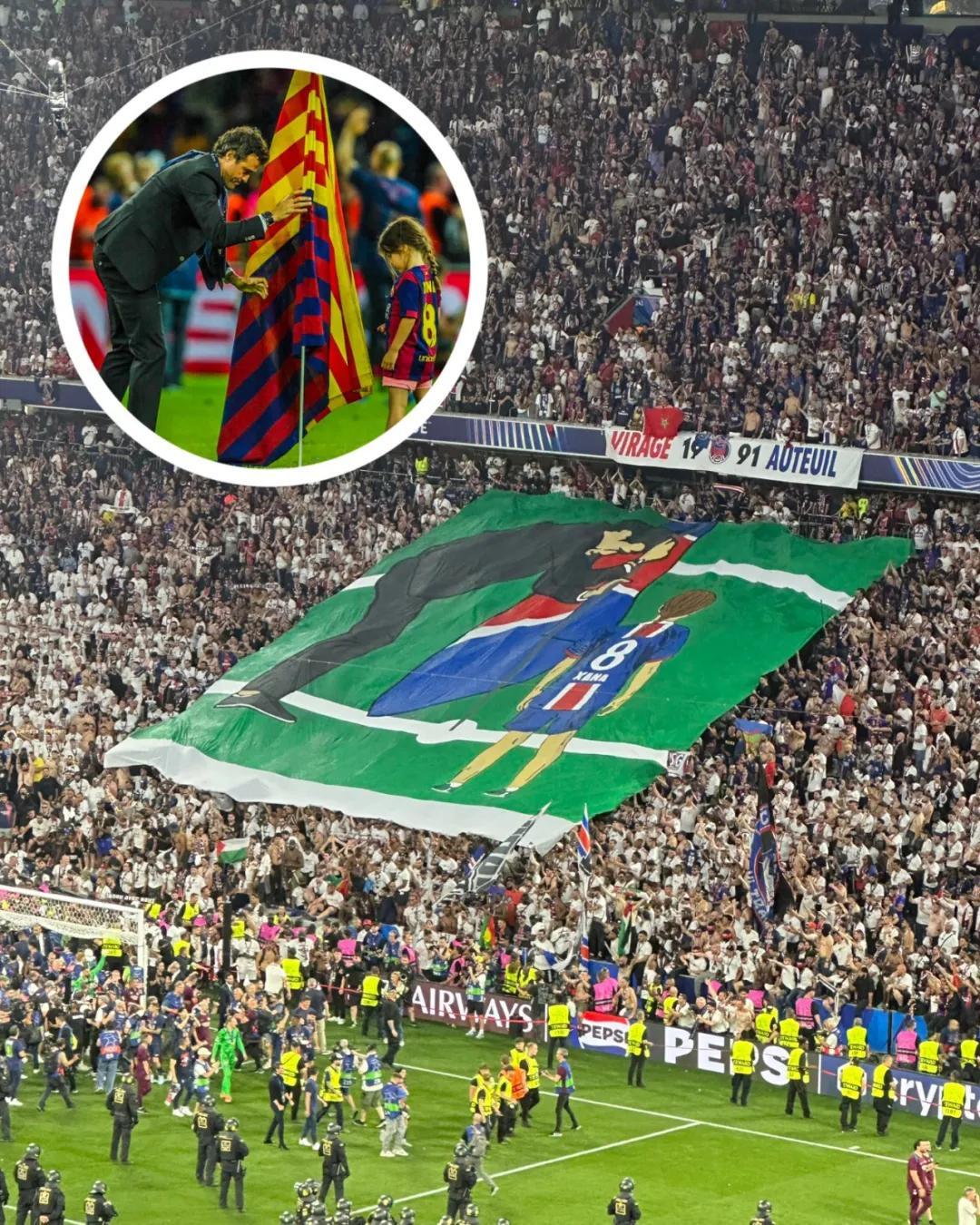 慕尼黑安聯球場的歐冠決賽夜,大巴黎球迷看臺上鋪開了巨大的Tifo,展現的是2015年歐冠決賽後,恩裏克與愛女夏娜經典的“插旗”照片,夏娜穿的是大巴黎球衣,恩裏克插的也是大巴黎旗幟。當年在柏林奧林匹克球場,率巴薩拿到三冠王的恩裏克將一面巴薩旗幟插在球場中央,與5歲的愛女一起慶祝,這張照片成爲歐冠史上最經典的溫情定格。在安聯球場如願以償的恩裏克脫掉外套,黑色T恤上同樣是“復刻經典照片”的卡通插畫——只是這次,他插上的旗幟同樣換成了大巴黎。