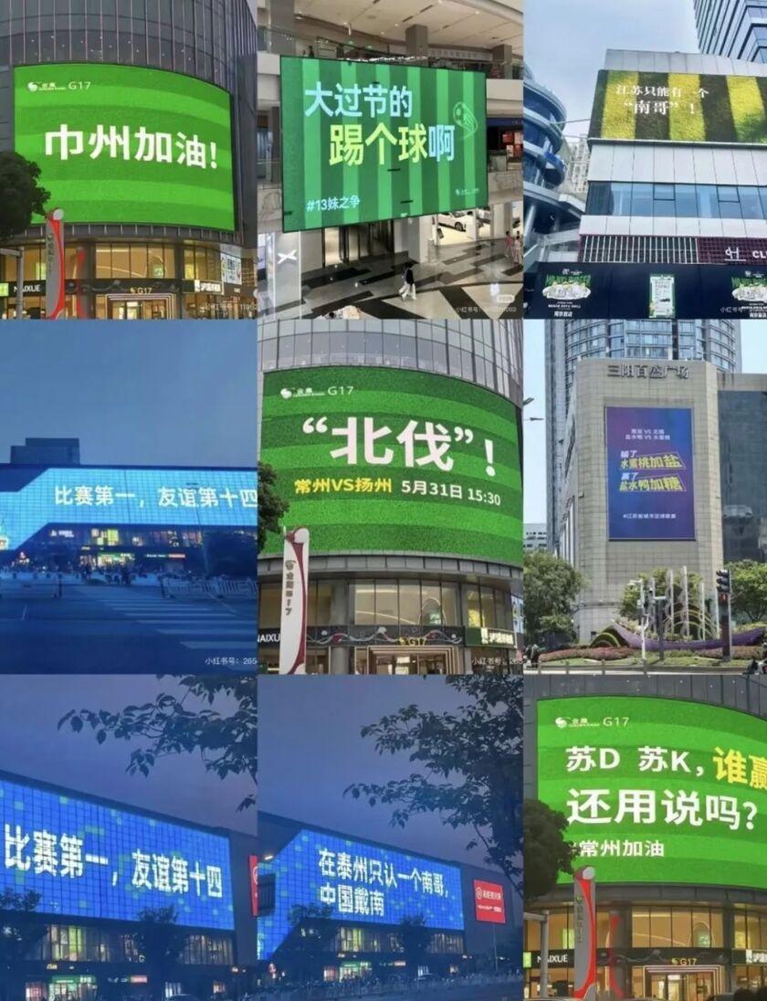 創意應援:鎮江球迷高舉“對淮安陳醋加徵關稅”,蘇州方陣揮動蘇繡圍巾,南通藍印花布裝點看臺;