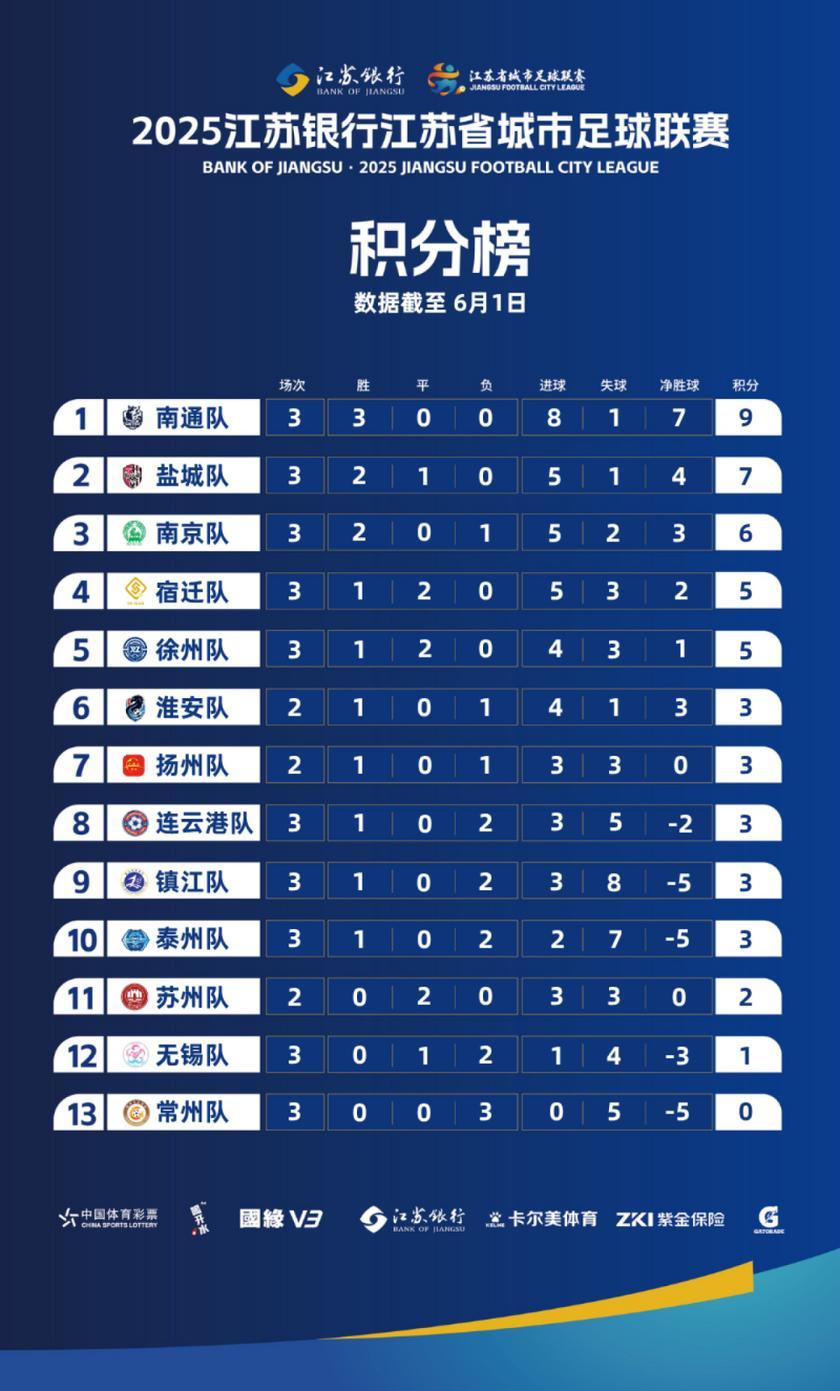“蘇超”最新積分榜