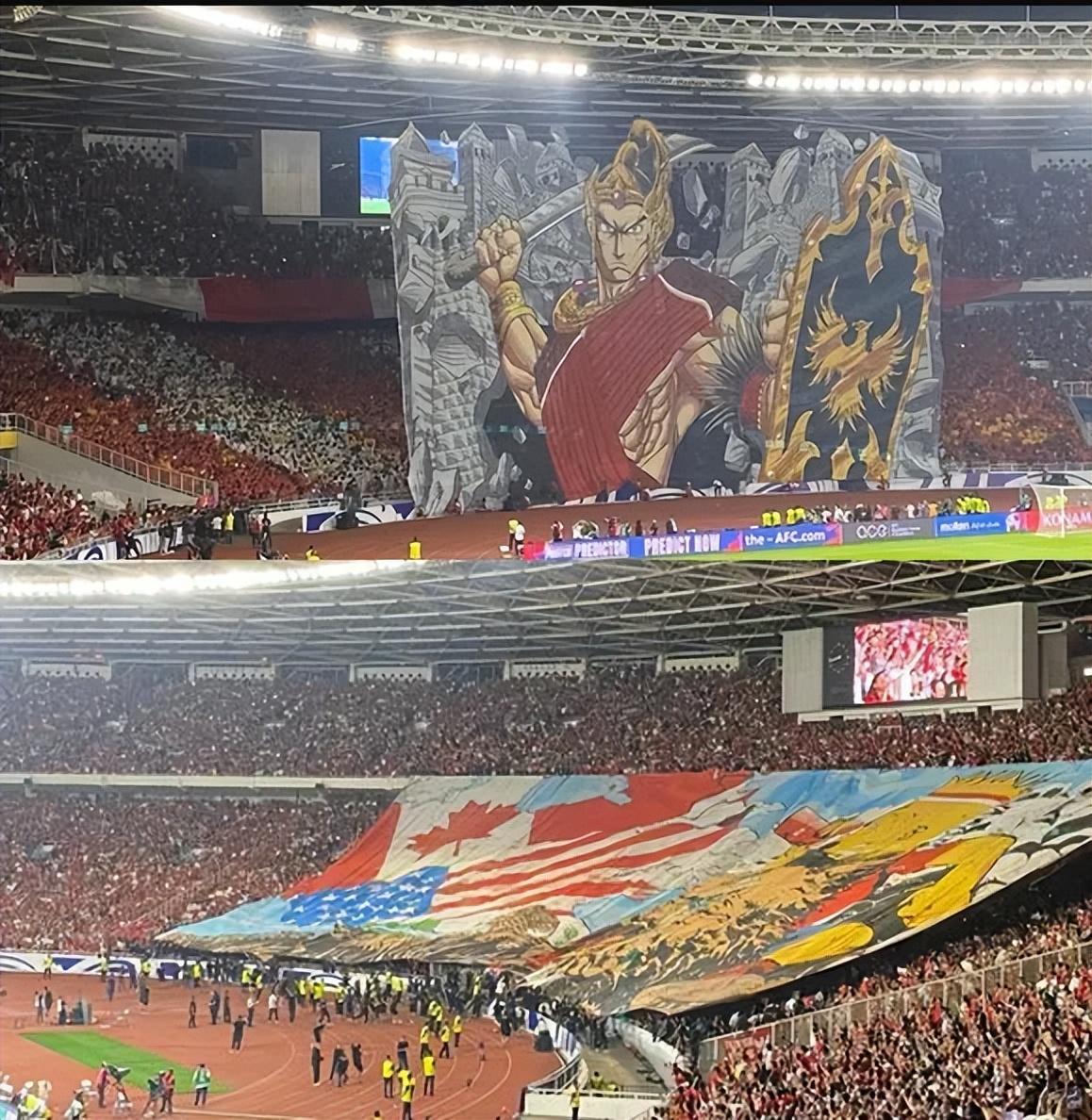 蘇加諾體育場球門後兩個看臺分別打出巨大Tifo:北看臺橫幅展現的是印尼神話英雄迦多鐸卡伽(Gatot Kaca)形象,他左手持繪有迦樓羅的盾牌,右手舞刀衝破城堡,象徵強大力量。橫幅上的迦多鐸卡伽形象,來自風靡東南亞的手機遊戲《決勝巔峯》的遊戲角色,而這款遊戲恰是中國手遊公司開發。南看臺橫幅圖案是美國著名動漫《辛普森一家》的主角巴特·辛普森,騎着迦樓羅飛向美國、加拿大和墨西哥國旗組成的圖案,寓意印尼隊要衝擊明年美加墨世界盃決賽圈。
