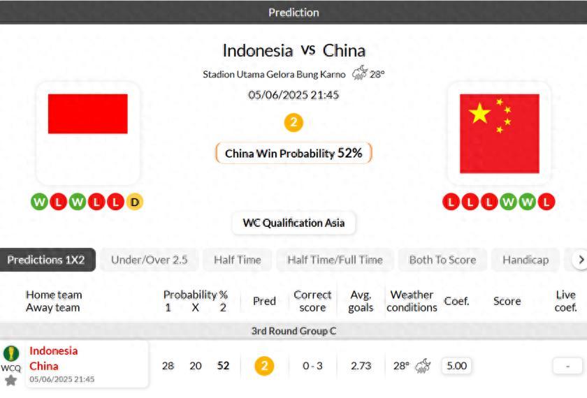 海外情報預測:世預賽生死戰!印尼0-3中國