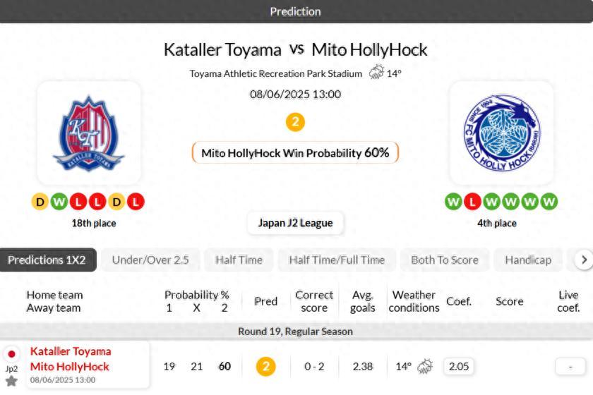 - Kataller Toyama''s performance has been disappointing of late, as they have won just 1 of their 14 most recent J2 League clashes.