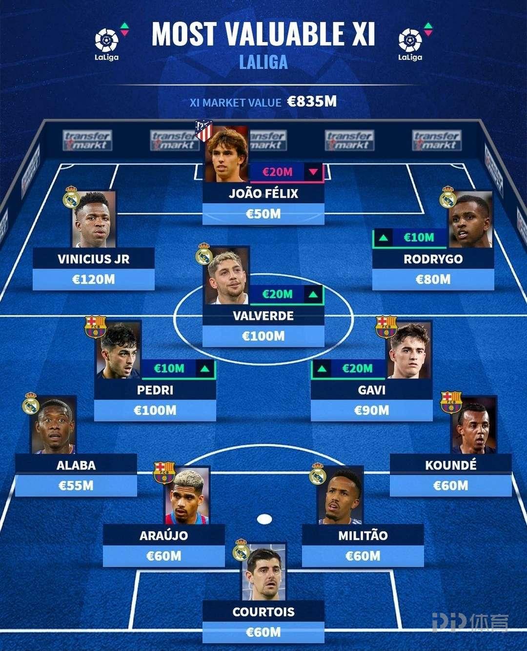 德轉不久前更新了世界足壇球員身價,並盤點了西甲球員身價最高的11人陣容,其中維尼修斯領銜皇馬共有6人入選,巴薩也有佩德里等4人在列,以下爲具體陣容:門將:庫爾圖瓦(皇馬,6000萬歐)後衛:阿拉巴(皇馬,5500萬歐)、阿勞霍(巴薩,6000萬歐)、米利唐(皇馬,6000萬歐)、孔德(巴薩,6000萬歐)中場:佩德里(巴薩,1億歐)、巴爾韋德(皇馬,1億歐)、加維(巴薩,9000萬歐)前鋒:維尼修斯(皇馬,1.2億歐)、菲利克斯(馬競,5000萬歐)、羅德里戈(皇馬,8000萬歐)