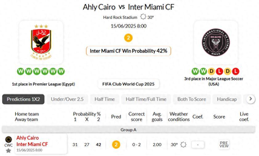 邁阿密國際在過去 6 場客場比賽中取得了 50% 的平局