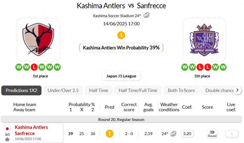 There are no losses for Sanfrecce in 5 of their most recent 6 games (J1 League)