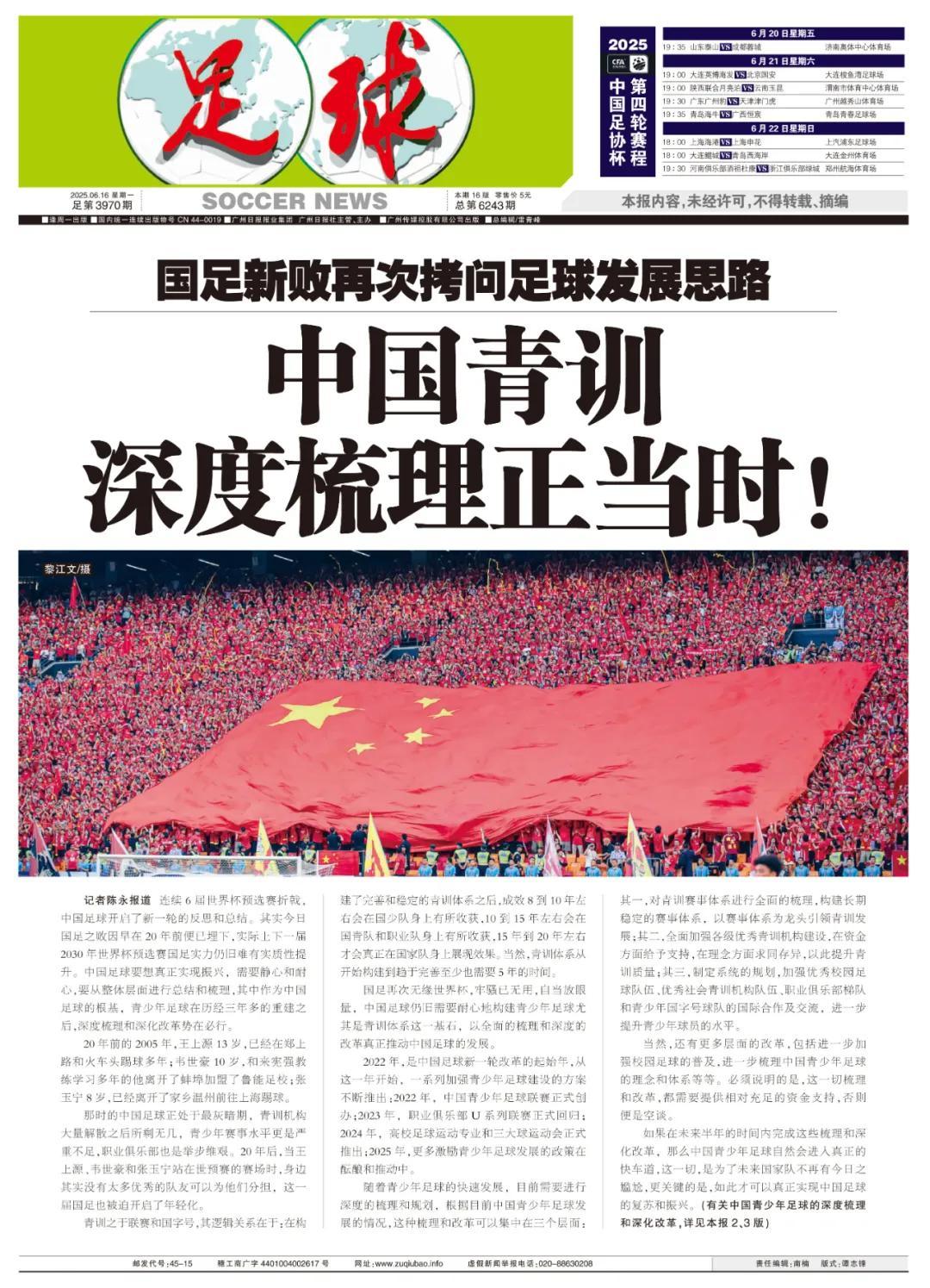 在國足新敗的背景下,過去三年多來快速發展的中國青少年足球其實也需要進行深度梳理和深化改革,更重要的是建立長期穩定的賽事體系和保障體系,並積極拓寬新的賽道。唯有如此,20年前因青訓乏力而導致今日國足之失敗,纔不會在未來重現。