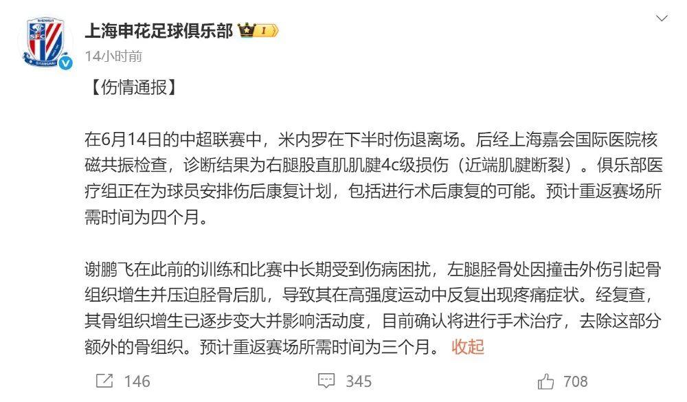 昨天晚上(6月16日),申花俱樂部發布傷情通報,通報了米內羅和謝鵬飛的傷情。