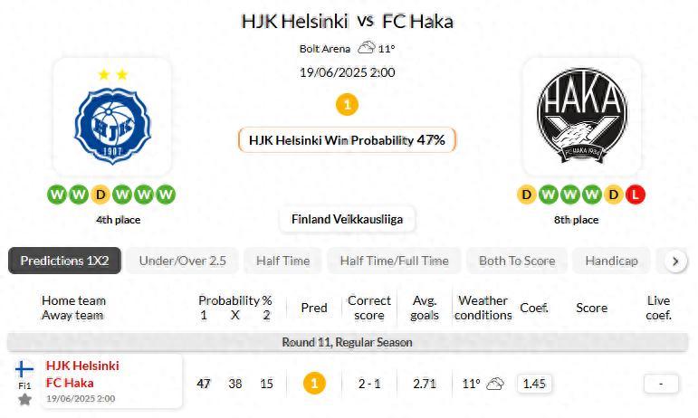 HJK Helsinki score an average of 2.20 goals in their home Veikkausliiga matches