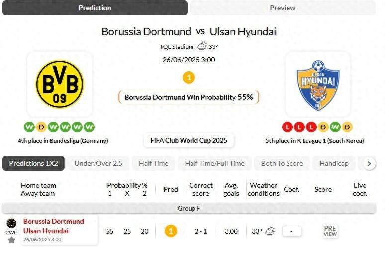 Borussia Dortmund and Ulsan Hyundai are scheduled to face off in the FIFA Club World Cup 2025 at TQL Stadium on June 25th.