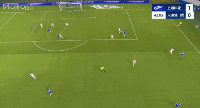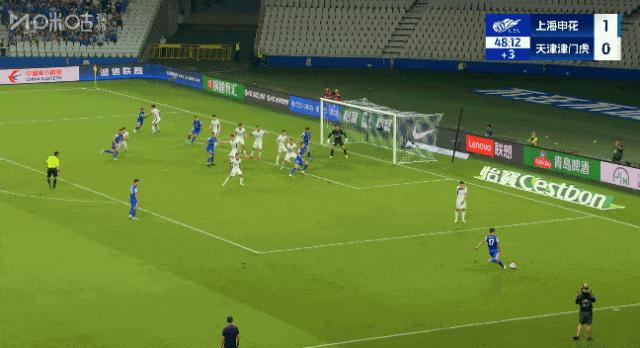 這粒進球如同是打開了一扇門,申花的第二粒進球很快接踵而至。上半場傷停補時階段,申花獲得任意球機會,高天意主罰,將球開到前點,蔣聖龍繞到基萊斯身前,巧妙地輕輕一碰,完成穿襠破門,將比分擴大爲2比0。