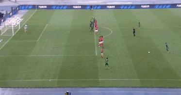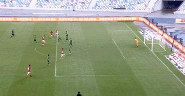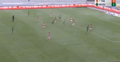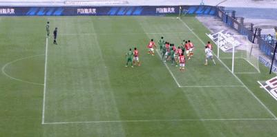 上半場補時第1分鐘,顧斌超遠距離打門,張健智撲救後皮球擊中橫樑,隨後再化解王瑒的補射。