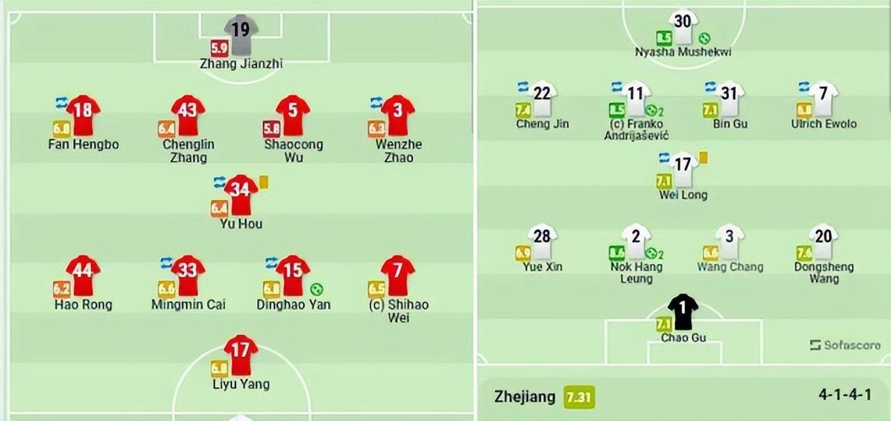 第74分鐘,顧斌開出右側角球,梁諾恆頭球破門完成梅開二度,浙江隊3-0領先。