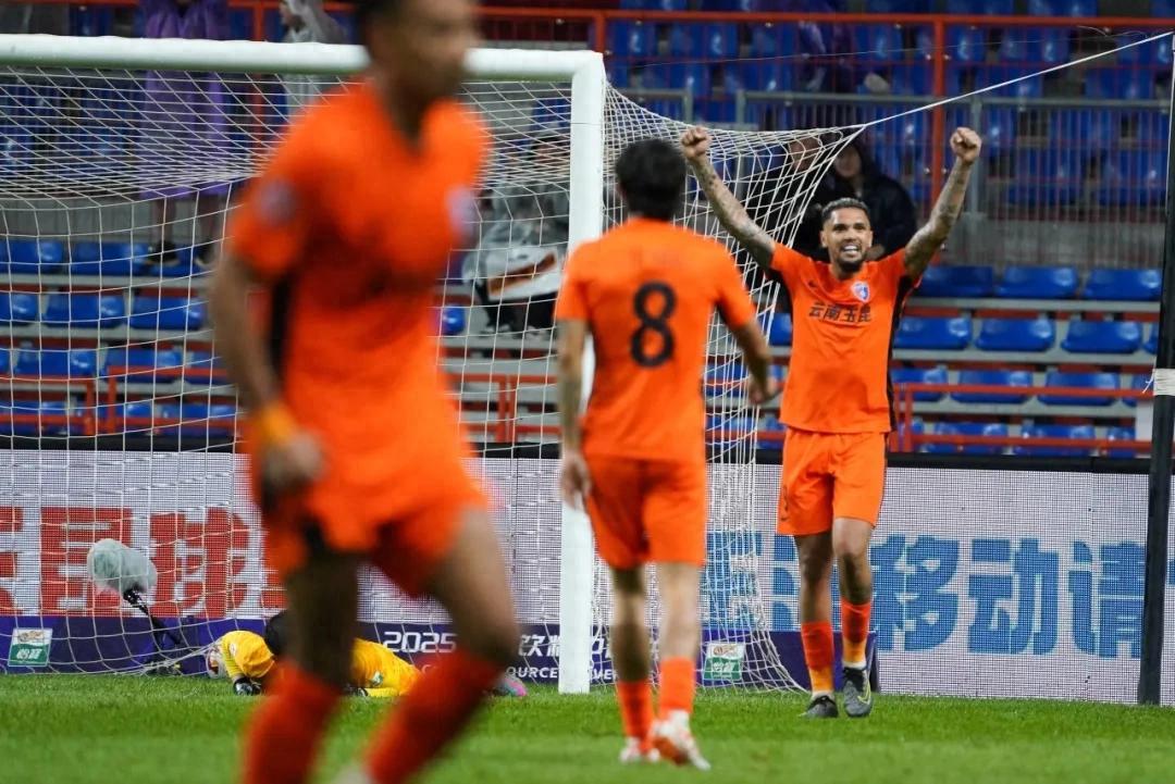 隨着主隊的前場壓迫漸有起色,第59分鐘客隊突送烏龍厚禮——何超回傳球給得過於突然、傳得過於用力,門將反應不及,皮球直躥網窩。1比1,玉昆幸運地扳回一分。10分鐘後,葉貴楚的遠射偏出了球門,但沒過多久,卡多索就還以一腳水準更高的遠射。
