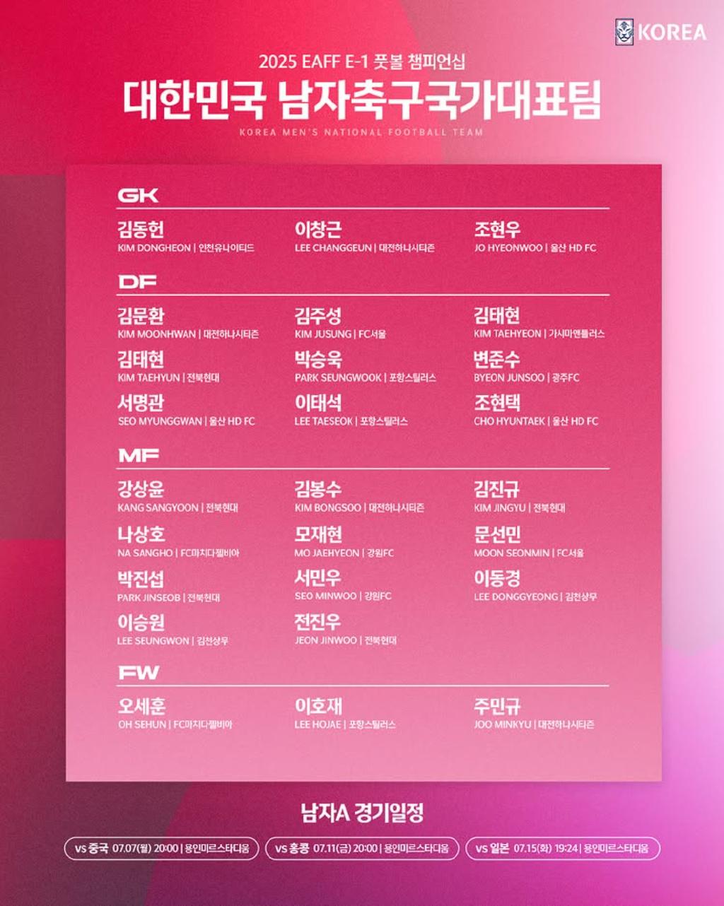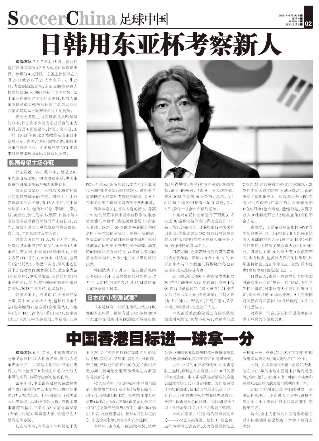 相比大多數主力國腳都是旅歐球員的日本,韓國有不少效力東亞聯賽的主力國腳,最近4屆東亞杯,韓國3次奪冠,上一屆(2022年)0比3慘敗給東道主日本位居亞軍。這次,洪明甫志在必得,期待主場重奪冠軍同時,也希望終結2021年以來對日連續兩場0比3慘敗的恥辱。