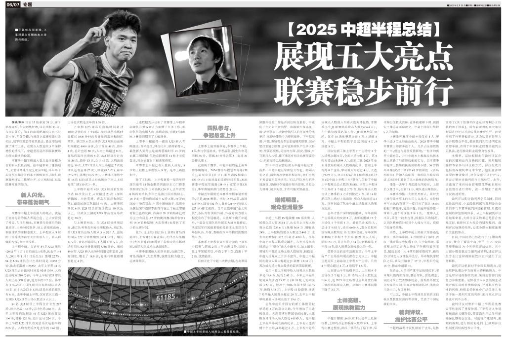 本賽季中超半程最大看點是王鈺棟爲首的新人批量湧現,給中超帶來了蓬勃朝氣。此前洋帥幾乎完全統治中超,今年終於迎來鄧卓翔爲首的本土教練復興。同時,聯賽裁判評議工作更公開、公正和權威,也是聯賽發展的助力。