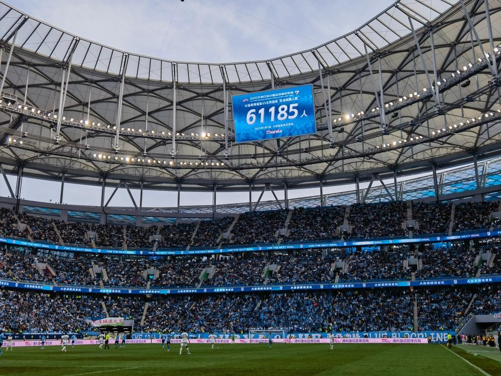 去年中超只有國安的新工體能貢獻單場超5萬的觀衆人數,今年增加了大連梭魚灣。大連英博對陣國安的比賽,大連梭魚灣球場入場人數是61185人,是中超上半程單場觀衆最高紀錄。上半程大連英博7個主場,4場超過6萬。上半程中超單場觀衆人數前六均被大連英博包攬,本賽季迄今J1聯賽單場最高人數(59574人),在中場僅能排名第5位。J1聯賽戰罷22輪,僅有10場比賽觀衆破4萬,4場破5萬。中超上半程的數字是22場超4萬,8場超5萬。