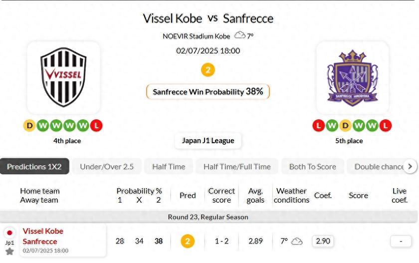 在J1聯賽最近的3場主場比賽中,神戶勝利船已經打進了2.5個進球
