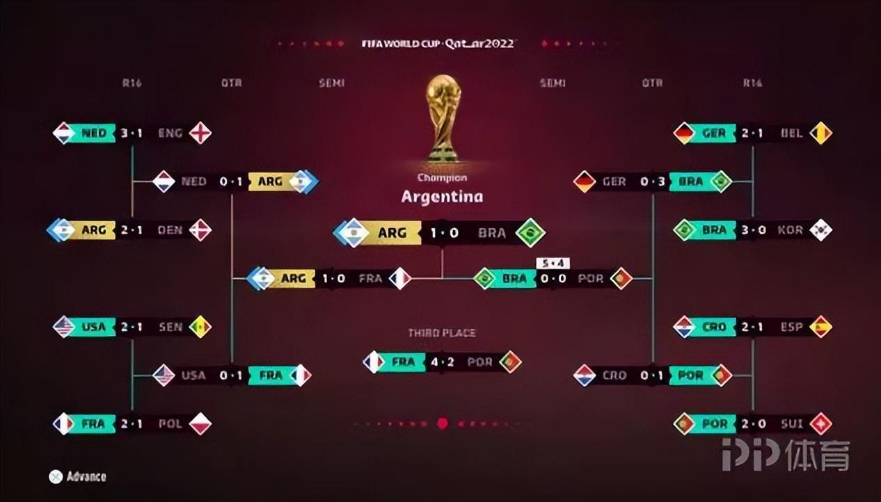 EA Sports在FIFA23中預演了本屆世界盃,最終阿根廷隊奪冠,梅西以8球斬獲賽事金靴。EA的推演過程爲阿根廷1/8決賽2-1擊敗丹麥,4/1決賽1-0擊敗荷蘭,半決賽1-0擊敗法國,決賽1-0擊敗巴西。EA曾成功預測過去三屆世界盃的冠軍,使用的均爲同樣預測模式,最後的結果都與實際相符。射手榜方面,梅西7場8球摘得金靴,德佩姆巴佩6球緊隨其後,C羅
