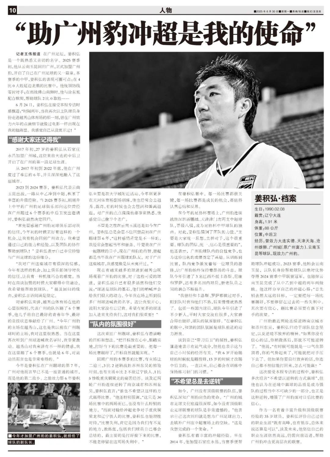 2023到2024賽季,姜積弘代表雲南玉昆出戰,一路從中乙衝到中超,積累了豐富的升級經驗。當2025賽季初,剛剛升上中甲的廣州豹足球俱樂部向這位曾經在廣州踢過6個賽季的中後衛發出邀請時,姜積弘毅然決定迴歸。