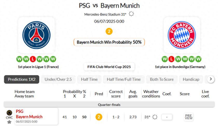 巴黎聖日耳曼在比賽中的平均進球數達到 2.50 個(2025 年國際足聯世俱杯)
