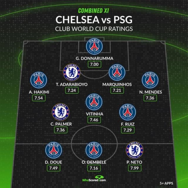 7月13日訊 本屆世俱杯決賽,數據機構whoscored統計了兩隊球員在本屆世俱杯的場均評分,並列出一套合體最佳陣。