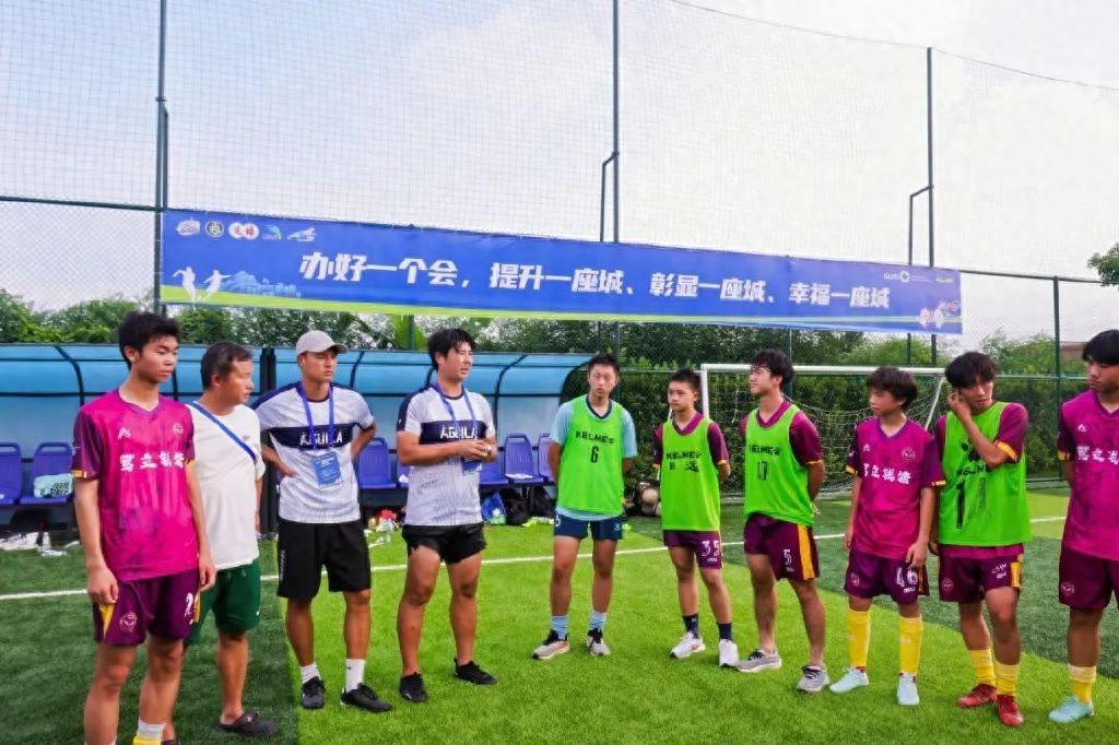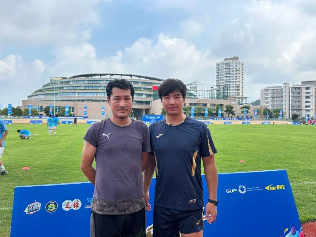 率領杭州高級中學錢塘學校(以下簡稱杭高錢塘)的隊伍出去打比賽,赤塚京介(下圖右)已有幾個年頭,他不會想到,在第二屆百年名校杯足球精英交流賽的小組賽首戰上,就迎來了一支同樣由日本教練掛帥的隊伍——橫琴粵澳深度合作區港澳生聯隊。後者的教練雨宮優佑(下圖左)在日職聯球隊大阪櫻花從事職業青訓工作,這次應邀前來執教橫琴粵澳深度合作區港澳生聯隊,他和隊伍只簡短磨合了不到一個禮拜。