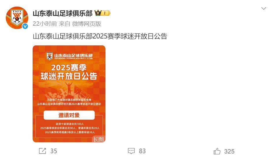同時,在14日,山東泰山發佈了“球迷開放日”的公告,時間是16日下午,邀請球迷爲:駐濟球迷會100人、球迷會年票會員30人、普通年票會員20人、2025賽季到場觀賽3場及以上的散客球迷30人。這是山東泰山今年首次舉行球迷開放日活動。