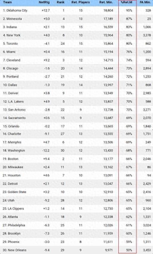 NBA自由球員市場開放已有半月,多數球隊完成了新賽季陣容框架的搭建。不少球隊選擇了保留上賽季的核心陣容,這其中自然以奪冠的俄克拉荷馬城雷霆隊爲代表——贏球的隊伍不必做出改變。NBA官網根據目前各隊陣容進行了延續性統計,衡量延續性的數據是留隊球員上賽季總出場時間佔球隊的比例,以下是最終結果。