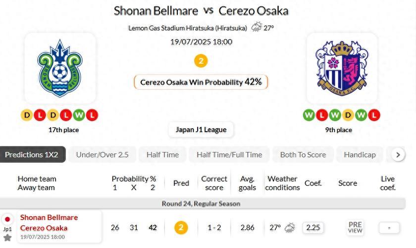 Cerezo Osaka have no losses in 16 of their 19 most recent encounters with Shonan Bellmare