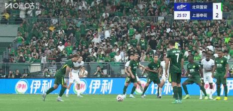 上半場傷停補時6分鐘,半場結束,北京國安暫1比2上海申花。