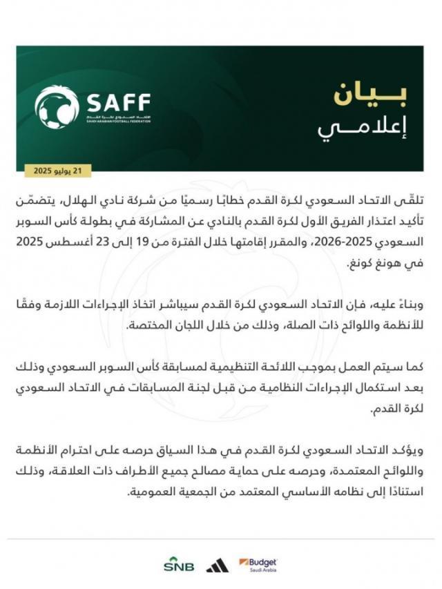 07月21日訊 沙特足協確認,利雅得新月退出今年8月份在中國香港舉辦的沙特超級盃比賽。