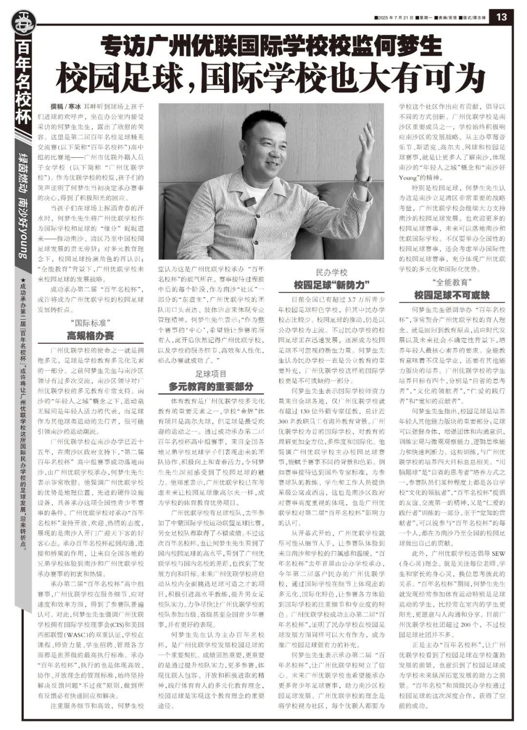 撰稿/寒冰 耳畔聽到球場上孩子們進球的歡呼聲,坐在辦公室內接受採訪的何夢生先生,露出了欣慰的笑容。這裏是第二屆百年名校足球精英交流賽(以下簡稱“百年名校杯”)高中組的比賽地——廣州市優聯外籍人員子女學校(以下簡稱“廣州優聯學校”)。作爲優聯學校的校監,孩子們的笑聲證明了何夢生當初決定承辦賽事的決心,得到了積極陽光的回應。