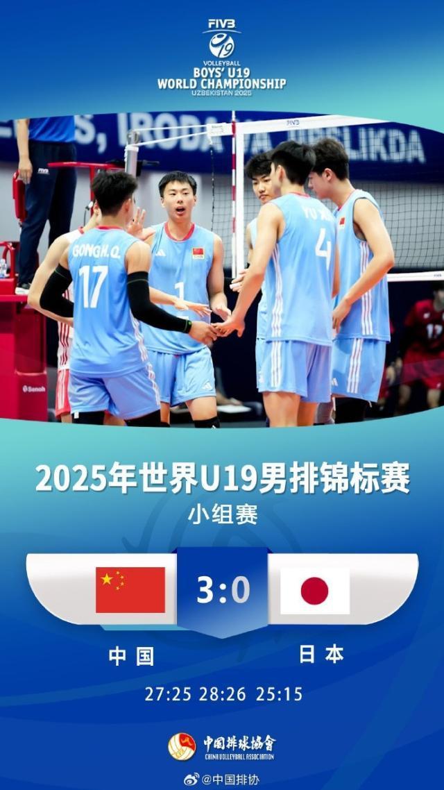 在剛剛結束的U19男排世錦賽首輪比賽中,中國男排3比0橫掃日本男排,取得開門紅。三局比分:27比25、28比26、25比15。本場比賽中國男排胡翰林12分、丁浩成12分、李旭陽9分、張浩7分、宮銘昊2分、宮浩乾1分。北京時間25日17時,中國隊將對陣保加利亞。