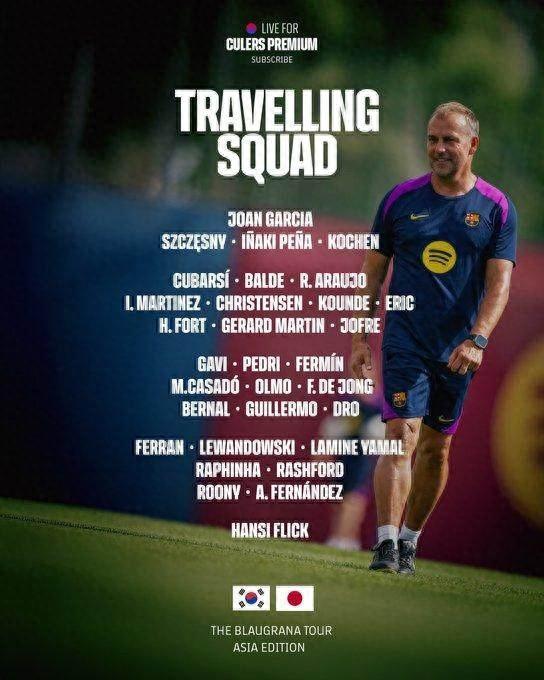 巴塞羅那發佈公告,宣佈重啓日本熱身行程,暨正式開啓2025年亞洲巡迴賽之旅:“兩天前,俱樂部曾宣佈取消與神戶勝利船的比賽,如今,相關問題已與主辦方妥善解決”一線隊已啓程飛往日本,將在7月27日與神戶勝利船過招。日本行後,巴薩將轉赴韓國,分別在7月31日和8月4日對陣首爾FC和大邱FC。紅藍軍團公佈此行名單,自宣背傷並自設歸期的門前棄將什琴斯尼,與轉會布拉加在即的保·維克托、老將羅梅烏共同缺席,新援拉什福德和巴爾德格吉在列,欲承旗亨利的14號拉什福德,有望迎來紅藍首秀。