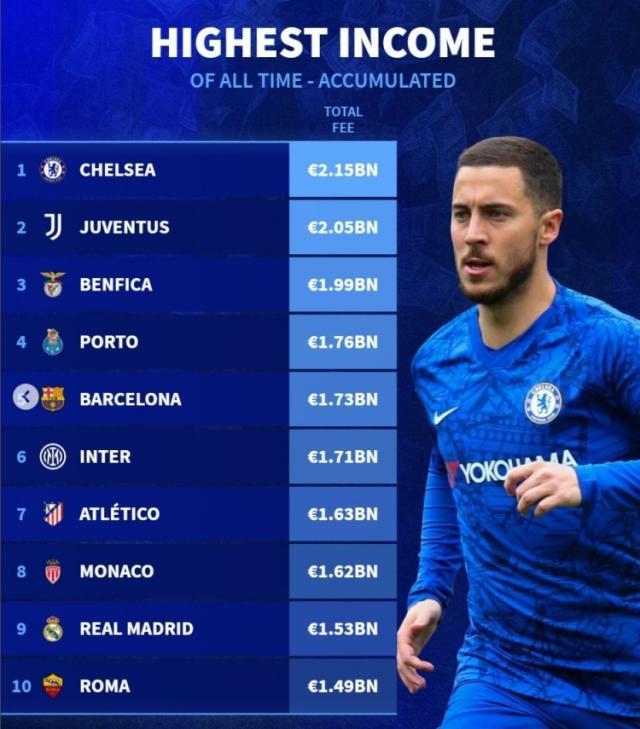 《轉會市場》統計了各隊歷史轉會費總收入情況,切爾西壓尤文居首。德轉列歷史轉會費收入榜:歐元