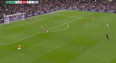 第77分鐘,加納喬前場搶斷後橫傳,B費突破到禁區中路抽射破門,曼聯反超比分3-2。