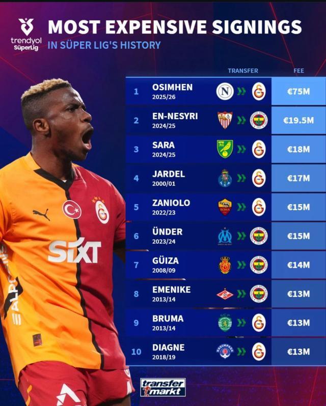 當地時間週三晚,奧西門飛抵伊斯坦布爾,在機場受到大批球迷的熱烈(如果不是狂熱的話)歡迎。據土耳其《每日晨報》報道,這位26歲的尼日利亞中鋒將和加拉塔薩雷簽下一份3+1合同,年收入1600-1800萬歐元。7500萬歐元的轉會費,則大幅打破了土耳其的引援身價紀錄,據“德轉”數據,此前土耳其聯賽的最高引援紀錄是安-奈西里,摩洛哥人去年以1950萬歐元價格從塞維利亞轉會費內巴切——算上浮動款項,奧西門讓這個紀錄翻了四倍!