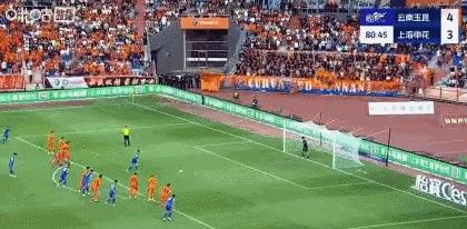 上半場補時7分鐘,第45+6分鐘,申花獲得任意球,高天意直接打門爲申花扳回一球,玉昆暫3比1領先申花。