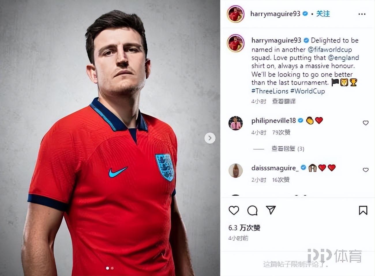 英格蘭昨日公佈世界盃名單,曼聯中後衛馬奎爾在列。馬奎爾在個人社媒寫道:“很開心入選世界盃名單,喜歡穿上英格蘭國家隊的球衣,這總是巨大的榮譽。我們期待拿出比上屆盃賽更好的成績。”2018年世界盃,英格蘭在三四名比賽中不敵比利時,拿到第四名的成績。英格蘭世界盃小組賽賽程11月21日21:00 英格蘭vs伊朗11月26日03:00 英格蘭vs美國11月30日03:00 威爾士vs英格蘭