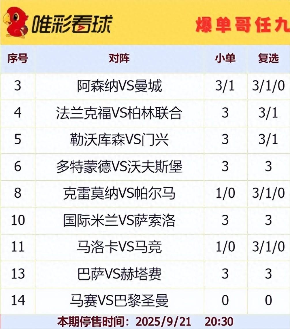 歡迎來到唯彩看球《爆單哥任九》專欄,今天爲大家帶來任九25136期推薦。爆單哥是資深玩家專攻勝負與進球數玩法,歐亞指數洞察力精準。每期免費提供高性價比小單及複選方案,爲您量身定製多檔方案自由選擇,助您一爆再爆!