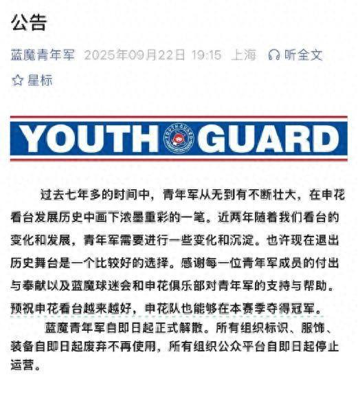 9月22日,上海申花球迷組織“藍魔青年軍”發佈公告,宣佈自即日起正式解散,公衆平臺自即日起停止運營。