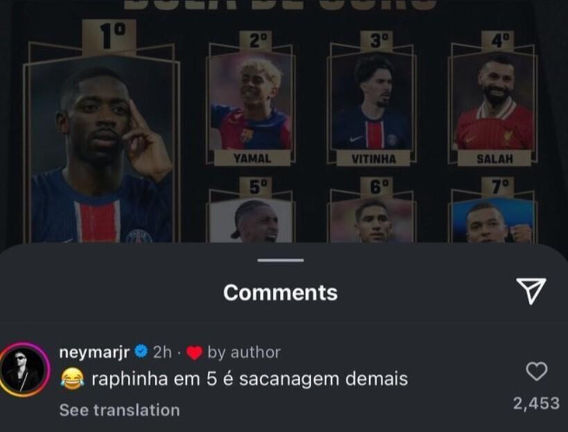 在球隊中相比自己金球排名更高的亞馬爾相比,拉菲尼亞同樣更出色。在歐冠中對陣拜仁、本菲卡、多特蒙德和國際米蘭都有出色發揮,然而在本次評選中未能超過表現不如自己的隊友亞馬爾。爲此巴西媒體痛批巴西球員在金球獎評選中被忽視,拉菲尼亞在巴西國家隊的老大哥內馬爾也忍不住下場吐槽。內馬爾在社交媒體表示:“拉菲尼亞第五?這簡直是笑話”。