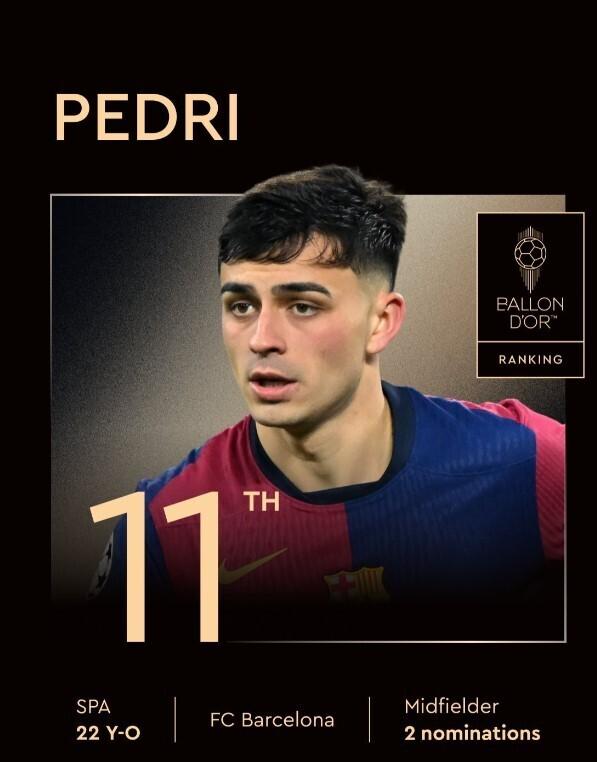 佩德里作爲現役最佳中場之一,球迷和媒體的質疑是非常合理的。本次無緣前十非常可惜,但佩德里最大的優勢是年輕,只要繼續保持如今出色狀態,前十排名甚至金球獎終將屬於他。