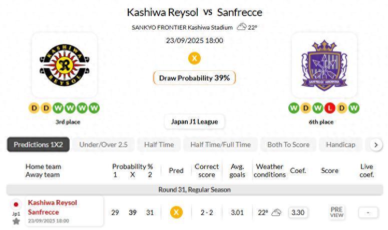 Sanfrecce are undefeated at HT against Kashiwa Reysol in their last 13 away league games