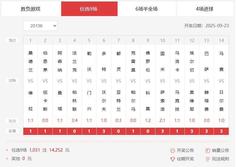 北京時間今天,勝負彩第25136期開獎結果揭曉。本期14場頭獎僅開出2注,單注獎金500萬元。14場2等開出72注,單注獎金72,686元。任九開1031注,單注獎金14,252元。其中14場滾存累計來到221萬餘元。